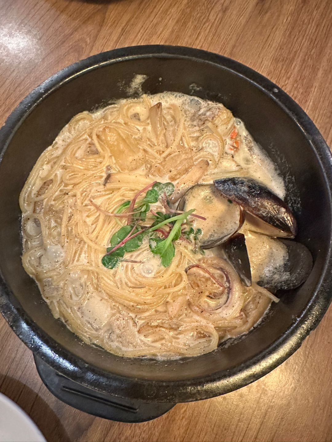 뚝배기에 담은 신선한 해산물 크림소스 스파게티 (꽃게, 오징어, 버섯, 양파, 홍합)