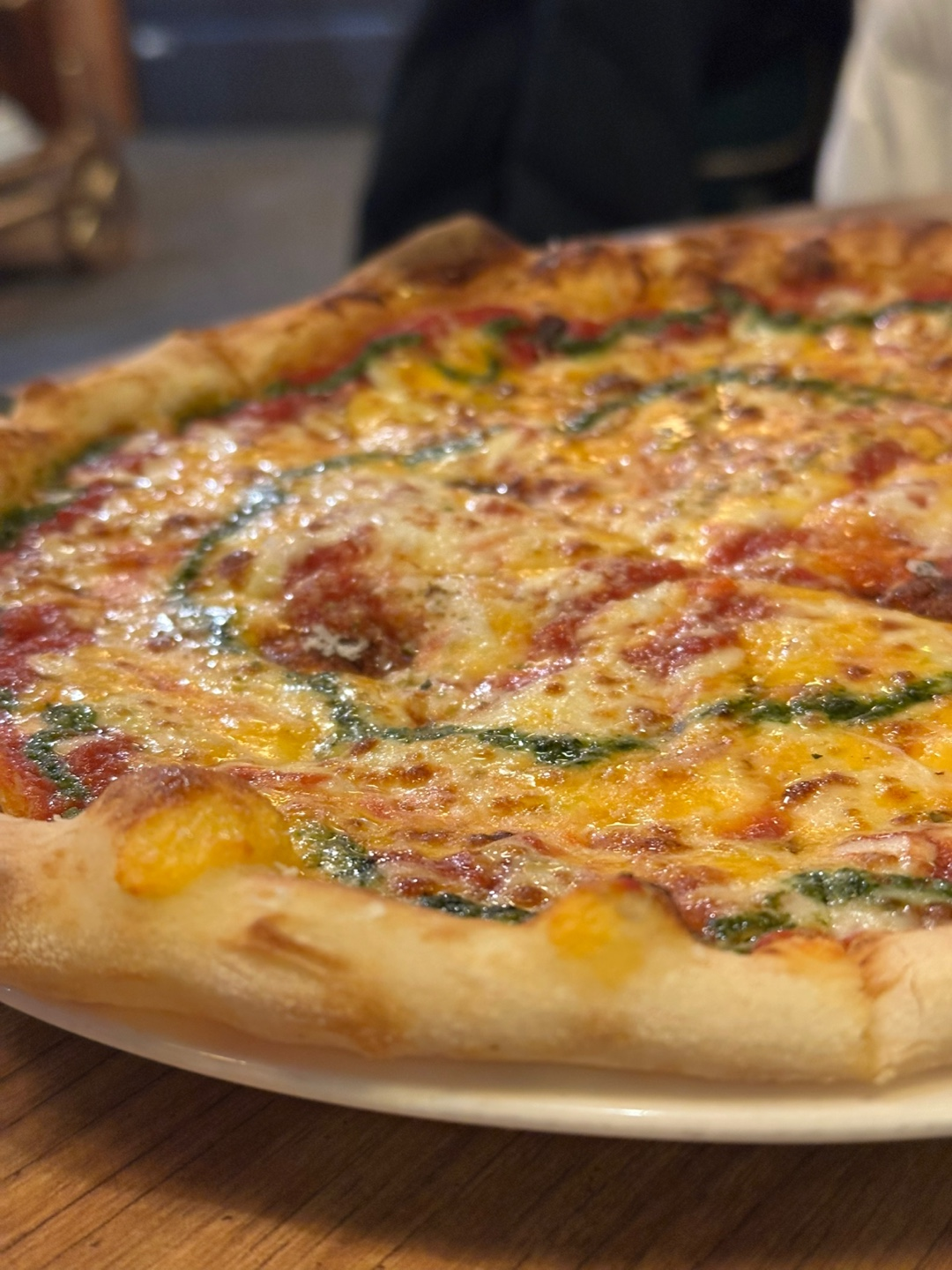 향긋한 바질로 만든 수제 페스토와 모짜렐라 치즈를 넣은 토마토 소스 피자