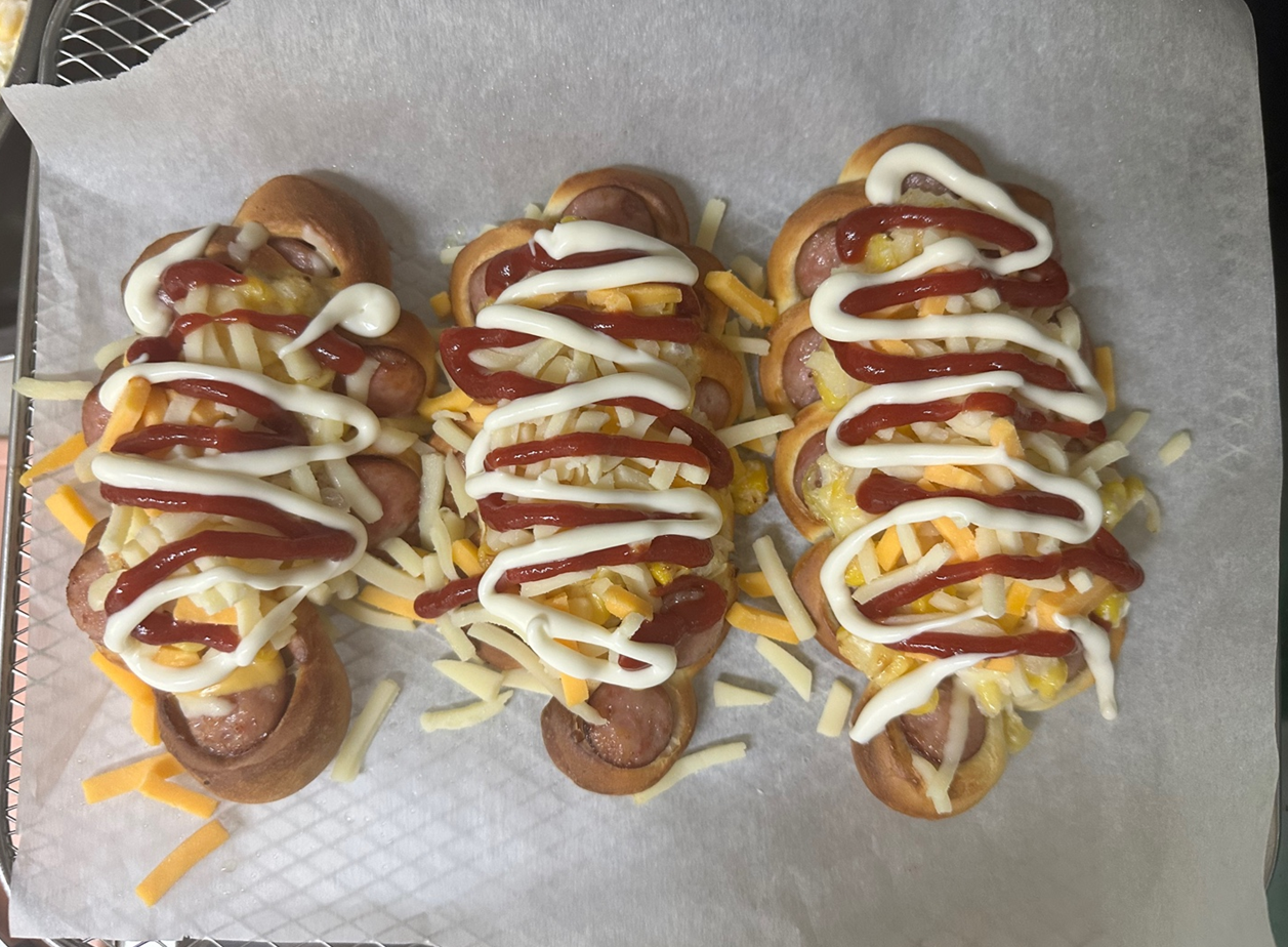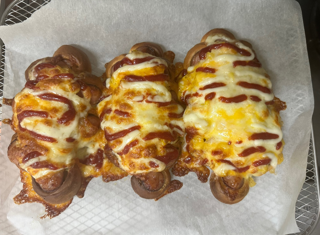 - 그리고 그 위에 케찹과 마요네즈를 예쁘게 뿌려주고 에어프라이어에 넣고 돌리면 끝입니다.