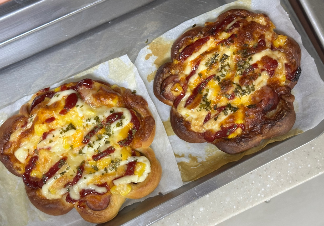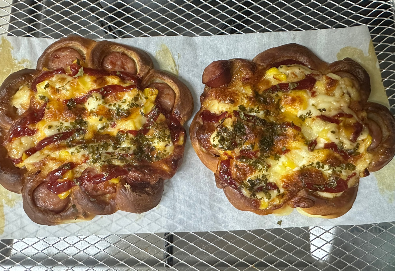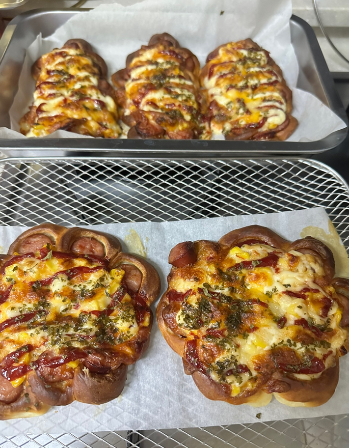 결과물인데 첫 피자빵 작품입니다. 하루종일 피자빵 먹다가 혼났습니다.